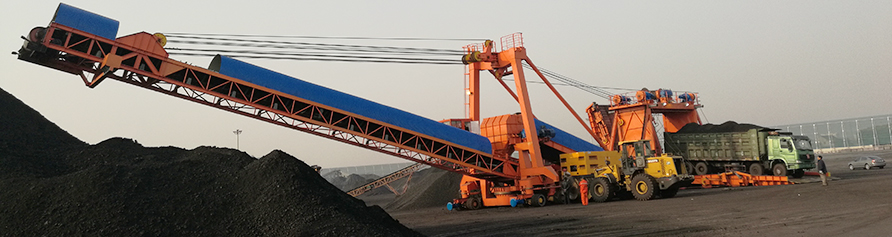 ![]() 1.皮帶機(jī)系統(tǒng)、2.臂架俯仰系統(tǒng)、3.金屬結(jié)構(gòu)、4.柴油機(jī)組、5.電氣系統(tǒng)、6.上車道及門架、7.行走機(jī)構(gòu)、8.配重系統(tǒng)、9.液壓系統(tǒng)、10.臂架回轉(zhuǎn)機(jī)構(gòu) ![]() 設(shè)備技術(shù)說(shuō)明 1).工藝流程:卡車運(yùn)輸物料——接料槽——上料皮帶機(jī)——轉(zhuǎn)載漏斗——臂架皮帶機(jī)——料場(chǎng); 2).為了滿足環(huán)保要求,采用噴淋技術(shù)防塵.在接料槽、轉(zhuǎn)載漏斗及比較落料點(diǎn)處均裝置噴淋系統(tǒng),起到壓塵作用.水箱設(shè)置容量為6立方米,可根據(jù)實(shí)際情況進(jìn)行調(diào)整; 3).臂架皮帶機(jī)具備俯仰功能及回轉(zhuǎn)功能,定點(diǎn)堆放物料噸位約為4800噸,在對(duì)應(yīng)4萬(wàn)噸海輪時(shí)僅需要移機(jī)10多次; 4).設(shè)備自帶行走功能,采用全驅(qū)動(dòng)式行走方式,前后車輪可以同時(shí)旋轉(zhuǎn)也可以分開旋轉(zhuǎn).使得裝料機(jī)能夠?qū)崿F(xiàn)前進(jìn)后退,左右平移,原地回轉(zhuǎn)等多自由度動(dòng)作,可以在堆料過(guò)程中實(shí)現(xiàn)快速移機(jī); 5).司機(jī)室設(shè)置在設(shè)備的前方, 控制動(dòng)作時(shí)視野開闊,設(shè)備上多處地方設(shè)置高清攝像頭,司機(jī)可以通過(guò)監(jiān)視器即可掌握設(shè)備周圍的所有情況及設(shè)備工作情況; 6).皮帶機(jī)驅(qū)動(dòng)電機(jī),行走電機(jī)均采用變頻電機(jī).可以根據(jù)實(shí)際裝載情況調(diào)節(jié)其運(yùn)行速度; 7).設(shè)備設(shè)置雙車道上卡車,減少了卡車的等待時(shí)間,極大的工作效率; 8).使用加料車型:60噸以下卡車、10噸以下裝載車; 9).額定40噸卡車運(yùn)行倒倉(cāng)時(shí)間為60s,峰值期間一小時(shí)循環(huán)60次,設(shè)備有效工作效率為2400t/h;允許卡車超載到60噸,生產(chǎn)率為3600t/h。受清倉(cāng)及煤炭種類影響設(shè)備平均時(shí)效生產(chǎn)率1400t/h。